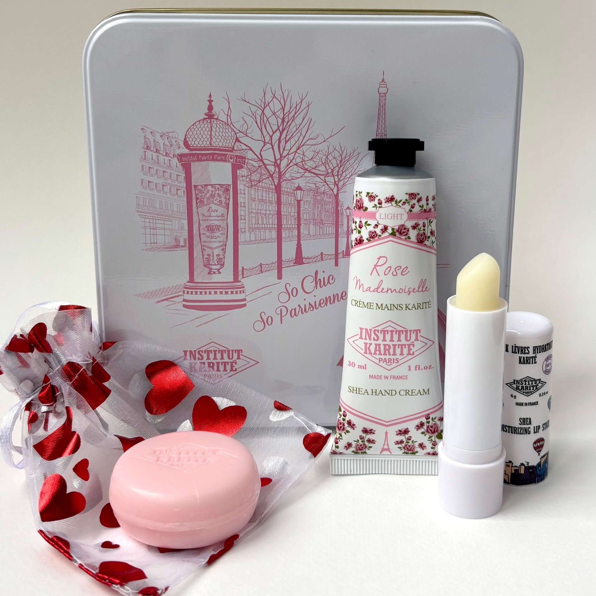 Adoptez l'élégance rose intemporelle avec une crème mains Rose Mademoiselle, un savon macaron et un baume à lèvres sans parfum. La crème soyeuse, enrichie au karité, offre une douceur durable avec des notes de rose raffinées. Parfait pour offrir romantiquement ou pour un luxe quotidien, présenté dans une boîte rose élégante au charme parisien sophistiqué.