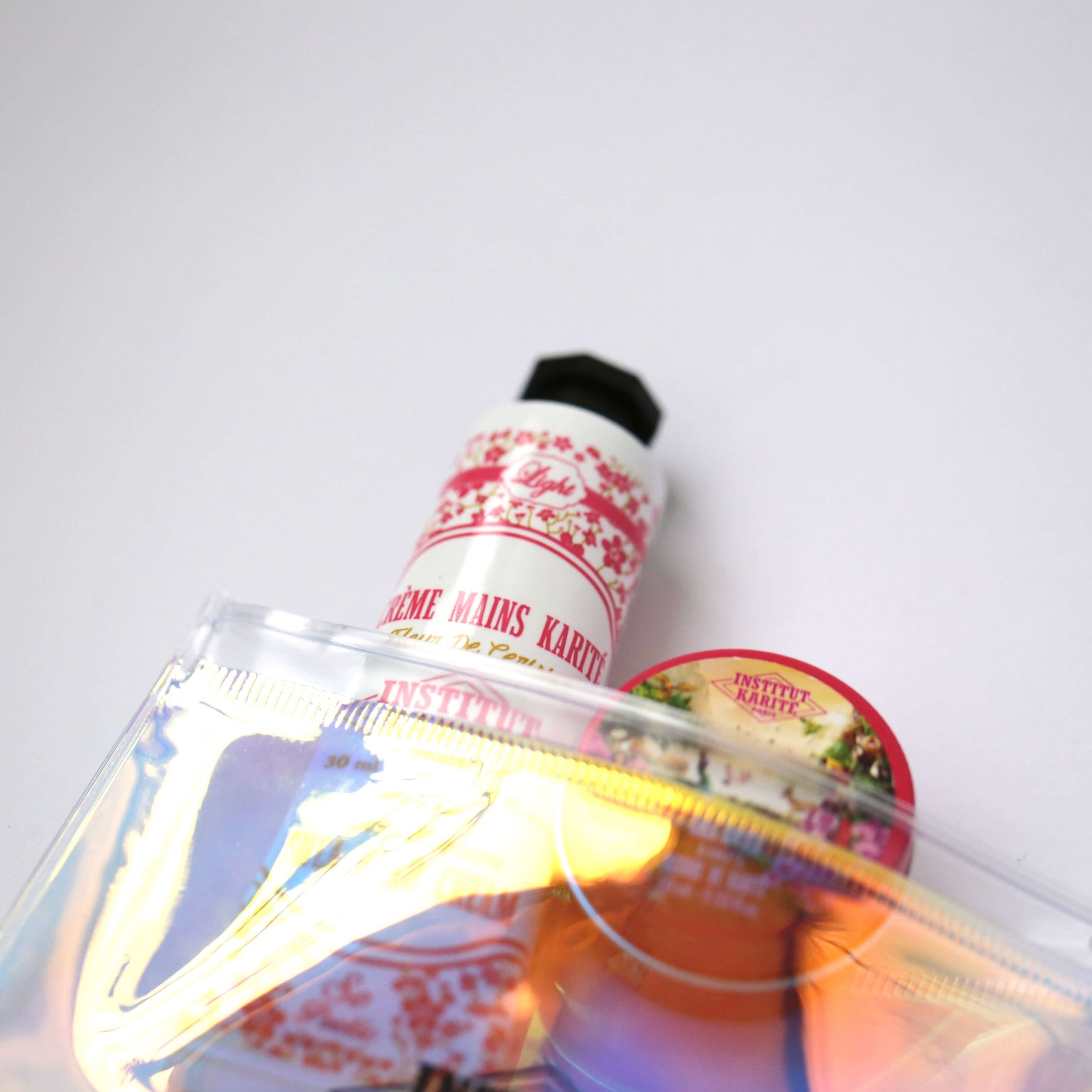 A : L'ensemble comprend : 1x Pochette Hologramme, 1x Crème Mains Karité Fleur de Cerisier (30mL), 1x Beurre de Karité 100% Pur (Format de Poche)