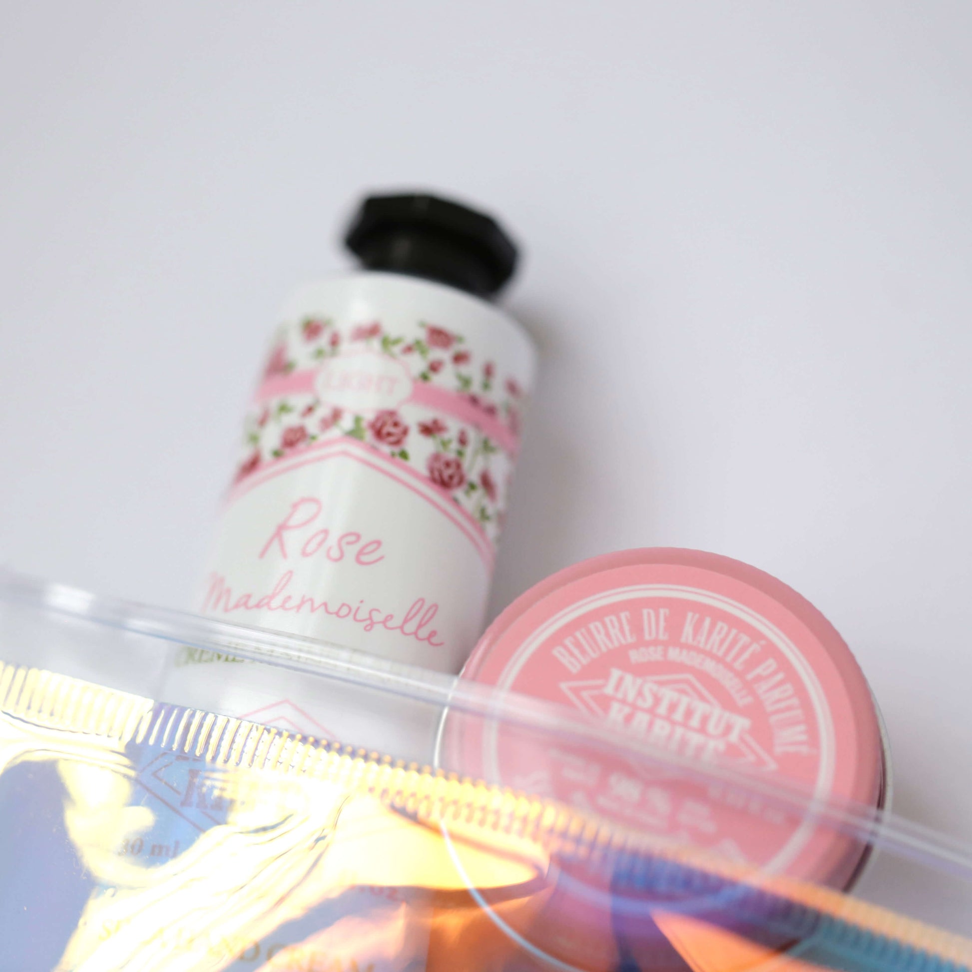 A: The set includes: 1x Hologram Pouch, 1x Rose Mademoiselle Light Shea Hand Cream (30mL), 1x Rose Mademoiselle Shea Butter (30mL)